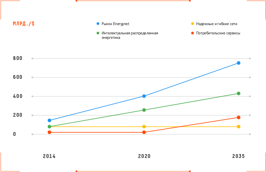 Объем выручки российских компаний на глобальном рынке (приоритет — БРИКС и развивающиеся страны) разномасштабных комплексных систем и сервисов интеллектуальной энергетики около 40 млрд. долларов в год.